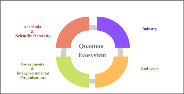 Quantum ethical frameworks and guidelines should be designed in such a way that they are applicable to the entire stakeholder ecosystem. They should also be formulated in consultation with all relevant stakeholders so as to encompass the needs and use cases of all of them. Broadly, quantum stakeholders can be broken down into the four categories shown in the figure below.